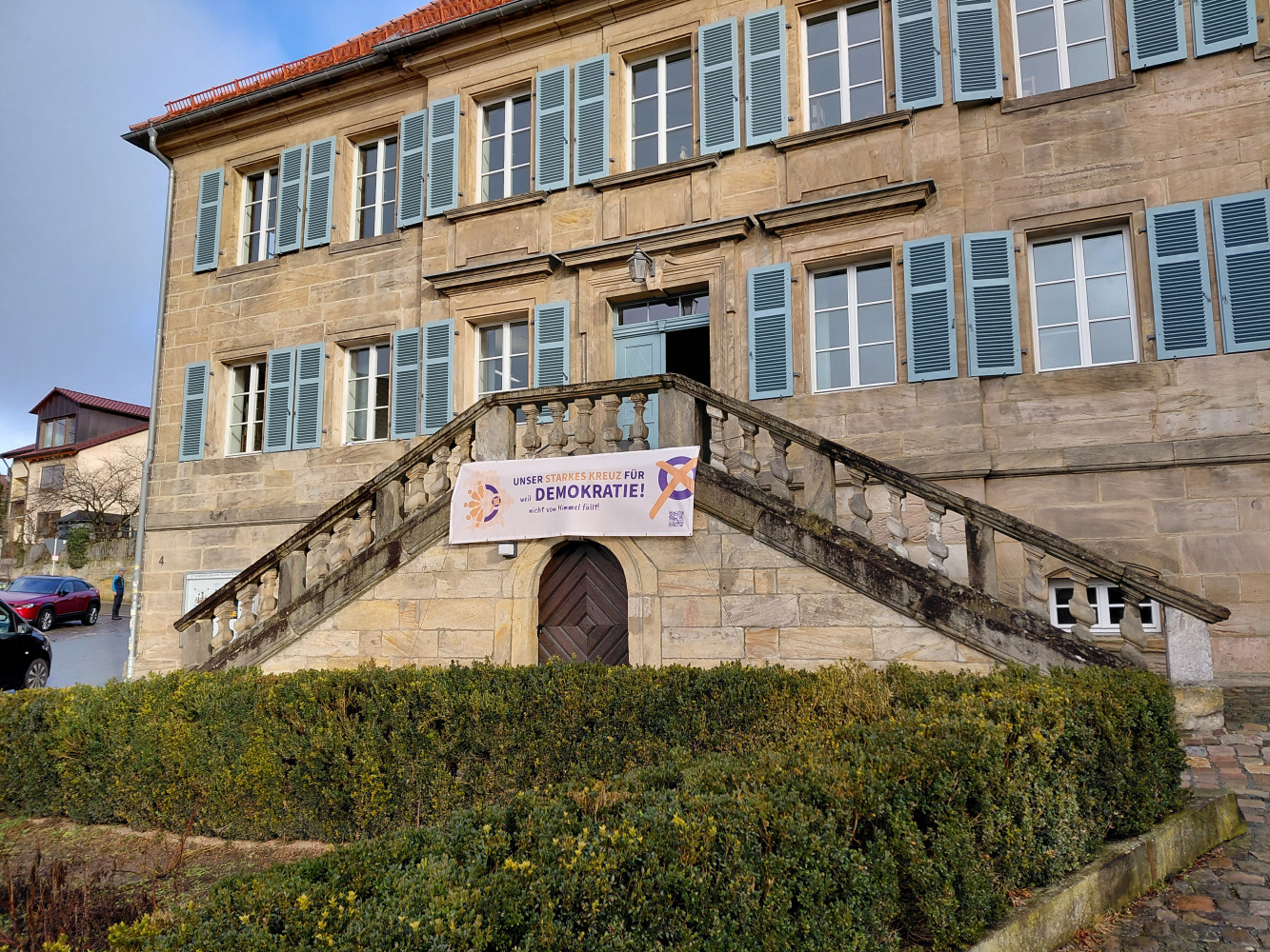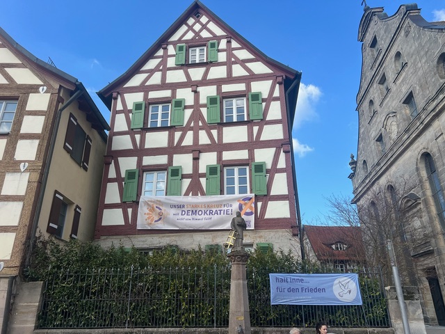 "Zwischen unserer Geschäftsstelle als Evangelisches Bildungswerk Oberfranken-Mitte (2. Stock) und der EvangelischenAltes Haus in Bayreuth mit Fahne "Unser sarkes Kreuz für Demokratie" Familienbildungsstätte im 1. Stock hängt seit 18. Januar die Fahne. Dieses Gebäude ist nicht irgendeines, sondern hat eine belastete Geschichte: Die jüdischen Eigentümer, Herr und Frau Weinberger, des sog. „Storchenhaus“ wurde von der Naziherrschaft enteignet – und es der Kirche in einem zweifelhaften Tausch gegeben. Die Kirche gab es – trotz Bitten der Nachfahren im Jahr 1948 nicht zurück – man einigte sich auf einen Vergleich.