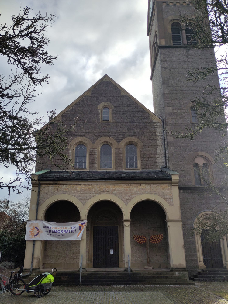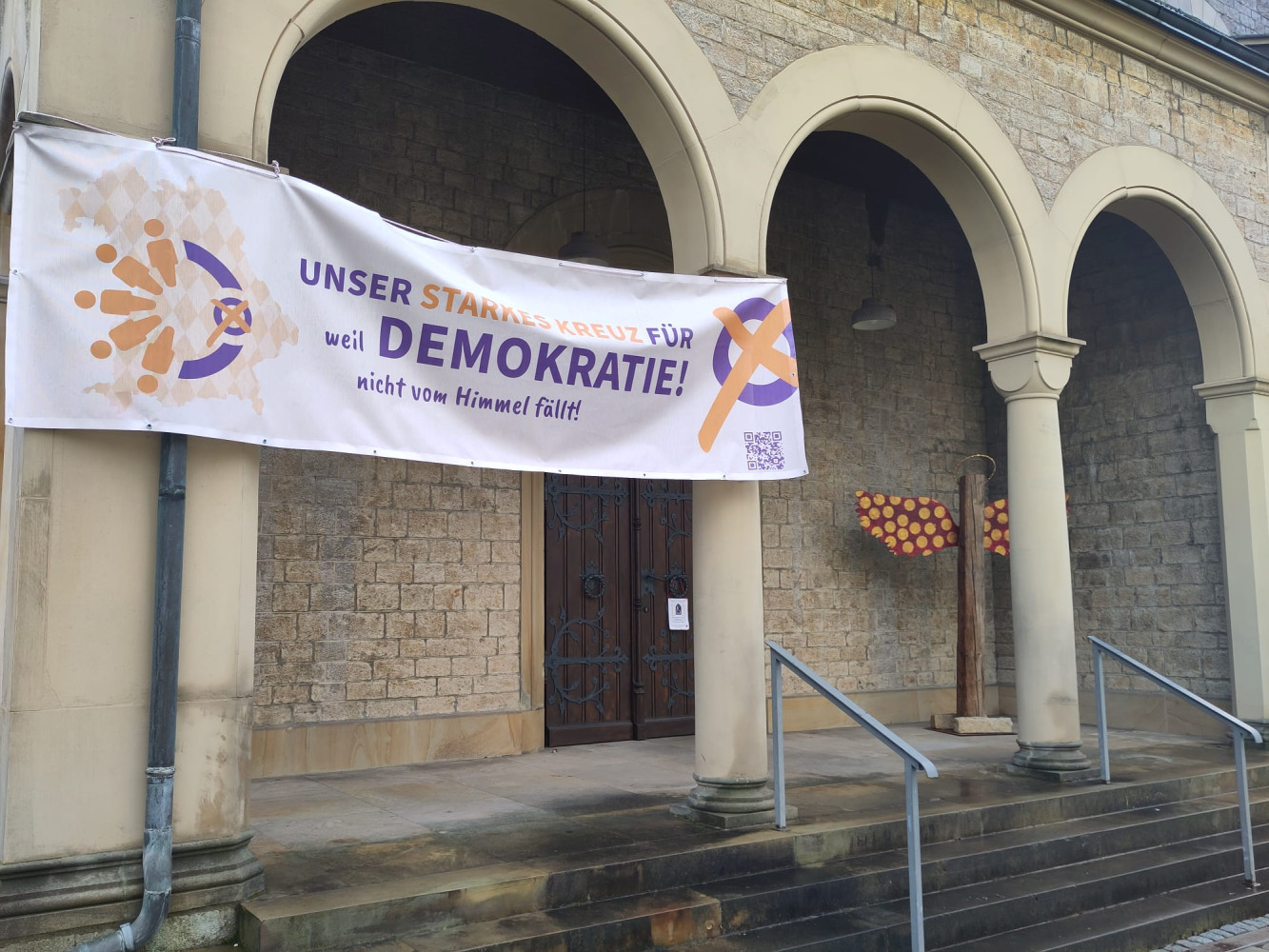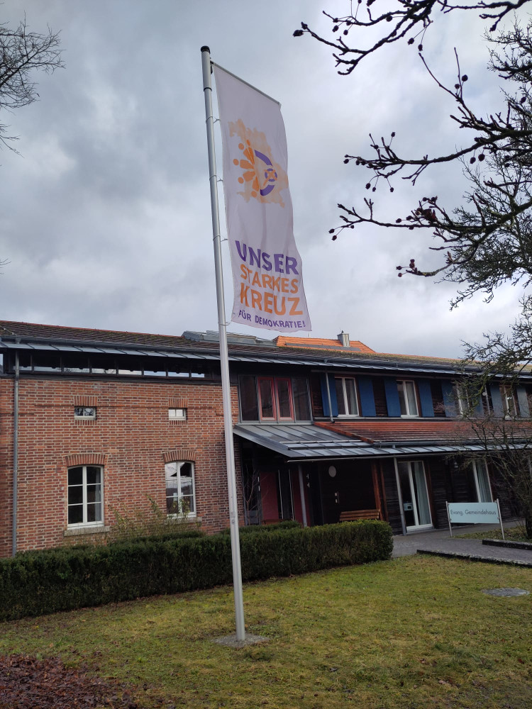 Die Fahnen und Banner mit dem "Starken Kreuz für Demokratie" hängen und wehen an über 140 Kirchen und Gemeindehäusern in ganz Bayern. Hier von die Bilder aus dem Kreuz+Quer-Haus der Kirche Erlangen, der Kirche in Plattling und der St. Anna Kirche Eckental-Forth.